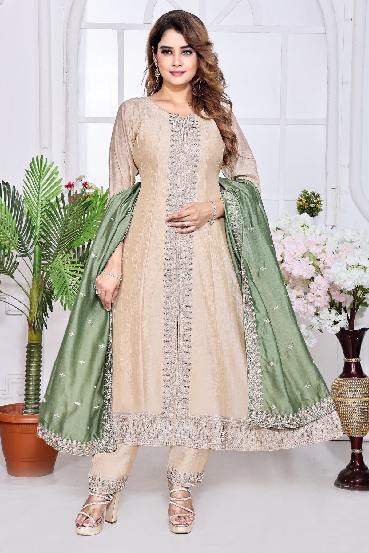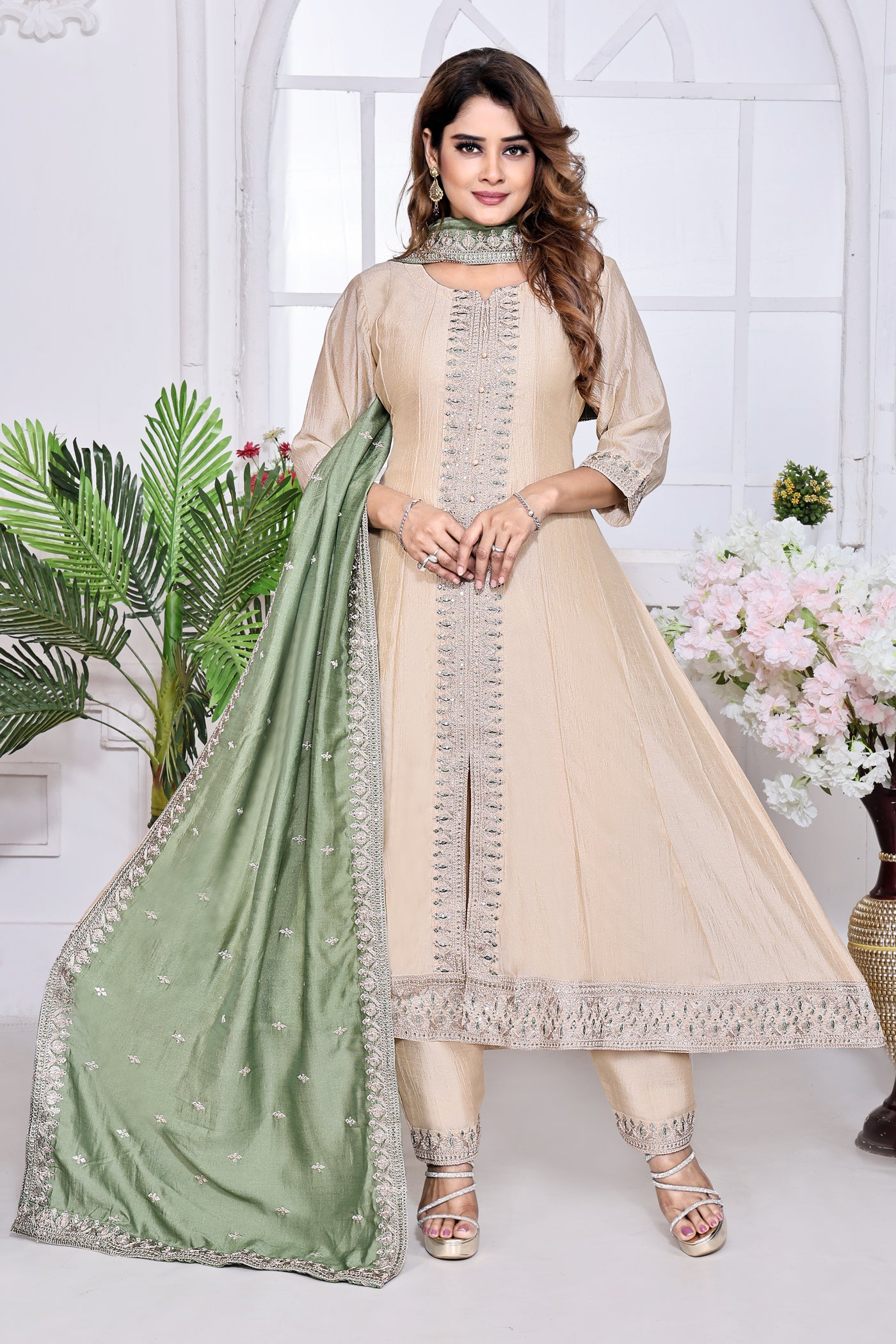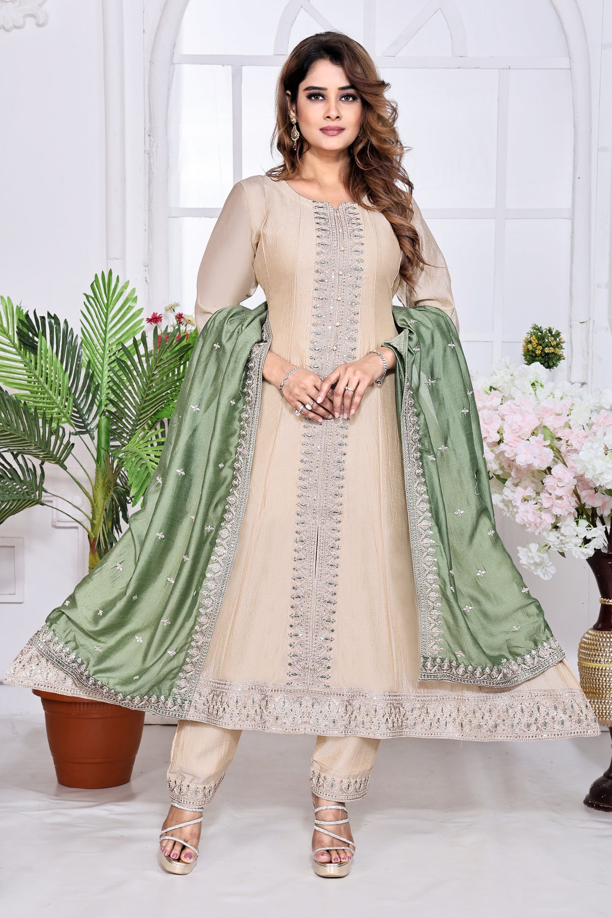 Beige Embroidered Silk Anarkali Kurta With Sage Green Dupatta Set